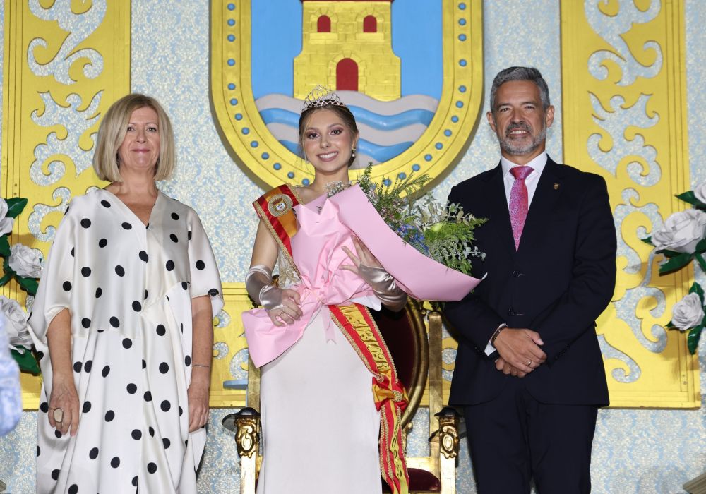 El alcalde ha coronado a la Dama Mayor, que también ha recibido un ramo de flores de manos de la delegada de Fiestas, Esther García, arropada por el aplauso y cariño de todo el público que llena en esta noche de viernes la plaza Bartolomé Pérez.