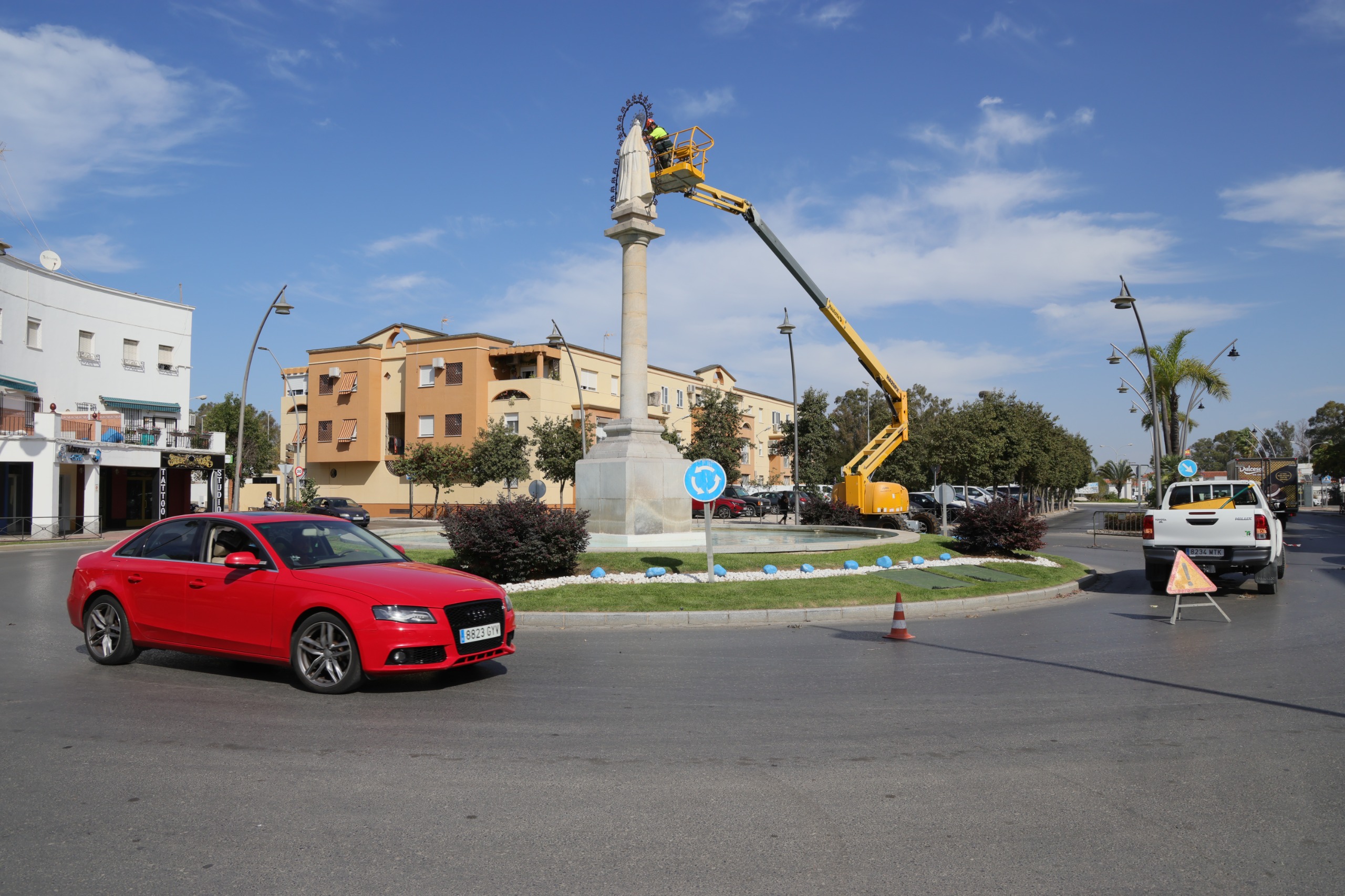 Coincidiendo con la celebración de las Fiestas Patronales, la imagen de la Virgen del Rosario que preside la rotonda de la plaza del Triunfo recupera todo su esplendor tras las labores de restauración y renovación que el Ayuntamiento de Rota ha realizado sobre varios de los elementos ornamentales que acompañan a esta imagen.