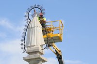Operarios de la Delegación municipal de Parques y Jardines, que dirige el concejal Jesús López, han procedido en esta mañana de lunes 6 de octubre a colocar de nuevo a la imagen de la virgen y del niño Jesús las coronas que se han estado limpiando, reforzando y restaurando para devolverles su brillo y estado ideal.
