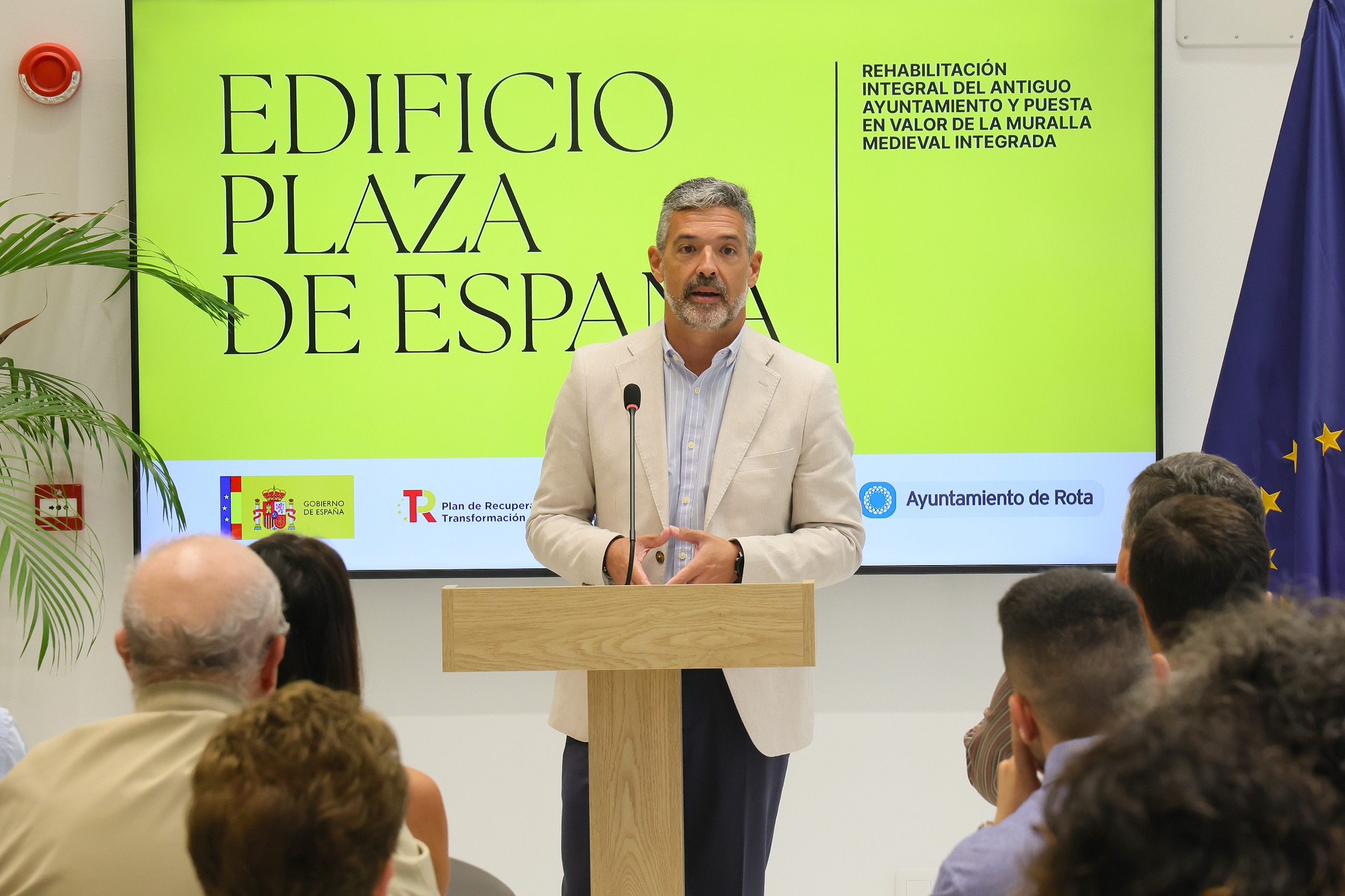 El alcalde de Rota, José Javier Ruiz Arana, presentaba este miércoles a la ciudadanía el resultado del ambicioso proyecto de remodelación y modernización que el Ayuntamiento ha ejecutado en el edificio municipal de plaza de España, número 1.