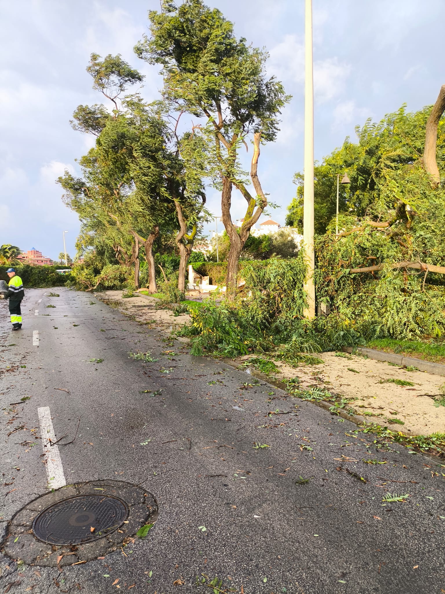 La zona del complejo turístico de Costa Ballena ubicada en el entorno de la avenida Carla de Orleans se ha visto afectada esta madrugada por el paso de una manga marina que ha provocado numerosos desperfectos materiales en el alumbrado público, el arbolado, señalizaciones y algunas viviendas; sin que se hayan registrado afortunadamente daños personales.
