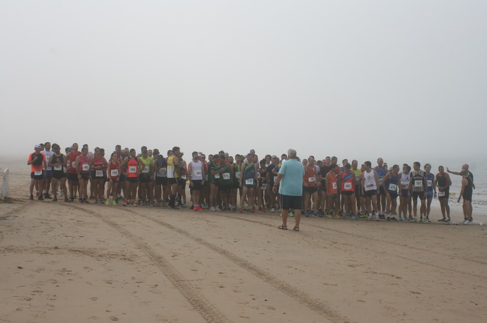 La espesa niebla que cubría la playa a primera hora de la mañana, no ha mermado ni las ganas ni el nivel de participación de esta prueba deportiva que organiza la Peña Dosa.