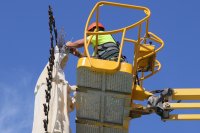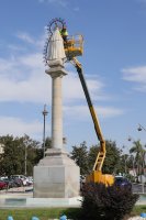 Operarios de la Delegación municipal de Parques y Jardines, que dirige el concejal Jesús López, han procedido en esta mañana de lunes 6 de octubre a colocar de nuevo a la imagen de la virgen y del niño Jesús las coronas que se han estado limpiando, reforzando y restaurando para devolverles su brillo y estado ideal.