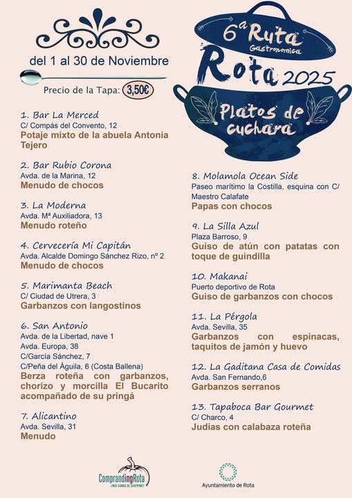La sexta edición de esta ruta, que se desarrollará del 1 al 30 de noviembre, con la participación de trece bares y restaurantes de la localidad, en los que vecinos y visitantes podrán encontrar los sabores más auténticos de guisos como el menudo de chocos, los garbanzos con langostinos, los garbanzos con espinacas, taquitos de jamón y huevo, la berza roteña con su pringá, las papas con chocos o las judías con calabaza roteña, entre otros exquisitos platos.